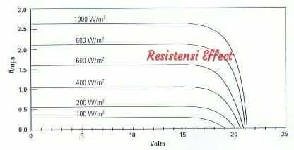 Semakin besar intensitas cahaya matahari secara proposional akan menghasilkan arus yang besar. Seperti gambar dibawah tingkatan cahaya matahari menurun, bentuk dari kurva I-V menunjukkan hal yang sama, tetapi bergerak ke bawah yang mengindikasikan menurunnya arus dan daya. Perlu diketahui Voltase solar panel tidak akan berubah oleh bermacam-macam intensitas cahaya matahari.