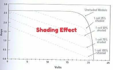 Shading adalah dimana salah satu atau lebih sel silikon dari solar panel tertutup dari sinar matahari. Shading akan mengurangi pengeluaran daya dari solar panel keseluruhan, Beberapa jenis solar panel module sangat terpengaruh oleh shading dibandingkan yang lain. Tabel di bawah ini menunjukkan efek yang sangat ekstrim pengaruh shading pada satu sel dari modul panel surya monocrystalline yang tidak memiliki internal bypass diodes. Untuk mengatasi hal tersebut solar cell panel dipasang bypass diode, bypass diode dipasang untuk arus yg mengalir ke satu arah, mencegah arus efect ke silikon yang kena bayangan. Jadi jika didekatmu ada antena, pindahkan antenanya, jika ada pohon, ya jauhkan dari pohon. Jika kehalangan rumah tetangga ya pindah rumah aja…hahaha.paham ya paklek