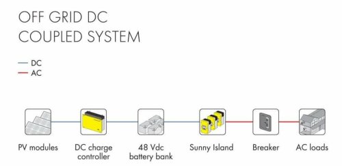 Bandingkan dengan sistem DC coupled dengan flow arus : PV Modules –> SCC –> Inverter –> Beban AC, sehingga arus akan berkurang pada saat melewati SCC dan inverter (effisiensi total lebih rendah).