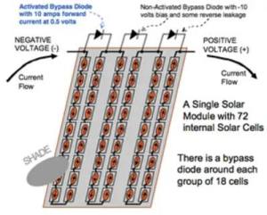 Secara garis besar memasang dioda bypass secara paralel terbalik dengan sel atau sekelompok sel. Selama operasi normal, ketika semua sel mendapat paparan sinar, sel-sel tersebut menghasilkan listrik. Dioda bypass mulai beroperasi ketika satu atau beberapa sel tertutup bayangan. Artinya dioda bypass akan bekerja saat ada beberapa cell terkena shading, maka pv diatas 100wp sudah kebanyakan dipasangi diode bypass pada junction box nya oleh pabrikan PV itu sendiri.