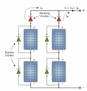 Pada awal sejarahnya PV System pastilah belum mengenal yang namanya Solar Charge Controller/BCR pemanfaatan energi matahari cenderung langsung dari PV Module menuju baterai penyimpanan. Untuk mendapatkan arus yang lebih besar dalam mengisi baterai digunakanlah konfigurasi paralel pada PV Modulenya dengan perhitungan Arus total = IA + IB. Pada siang hari pada saat matahari terik ada beda potensial yang tinggi pada keluaran PV Module ini yang akan mengaliri arus charging kedalam baterai yg memiliki beda potensial rendah sampai penuh. Nah disaat malam hari karena tidak ada sinar matahari maka beda potensialnya menjadi terbalik dimana PV module rendah potensialnya dan baterai malah tinggi potensialnya karena sudah terisi penuh disiang harinya. Karena ada beda potential tinggi pada baterai yang akan kembali mengalir ke PV module yg memiliki potensial rendah, maka harus/wajib dipasang “Blocking Diode” agar arus tidak bisa mengalir balik ke PV Module yang bisa membuat habis isi baterai. Metode ini berlaku untuk PV System yg konvensional tanpa menggunakan SCC/BCR, namun jika sudah menggunakan SCC/BCR fungsi “blocking diode” ini sudah tidak efektif lagi karena sudah ada didalam SCC/BCR. Fungsi Blocking Diode akan lebih efektif jika digunakan utk penambahan sistem charging baterai external.