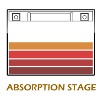 Beberapa produsen pengisi daya menyebut tahap penyerapan ini sebagai tahap pemerataan. Kami tidak setuju dengan penggunaan istilah ini. Jika baterai tidak dapat menahan muatan, atau arus tidak turun setelah waktu pengisian yang diharapkan, baterai mungkin mengalami sulfasi permanen, nah itu bisa buruk sekali. Pada Tahap ini membutuhkan lebih banyak waktu. Sebagai contoh, sisa 20% baterai membutuhkan waktu lebih lama dibandingkan dengan 20% pertama selama tahap BULK. Arus terus menurun hingga baterai hampir mencapai kapasitas penuh.