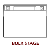 Tujuan utama charge baterai adalah untuk mengisi ulang baterai. Tahap pertama ini biasanya tegangan serta arus listrik tertinggi yang bisa digunakan. Tingkat pengisian daya yang dapat diterapkan tanpa mengakibatkan baterai terlalu panas dikenal sebagai BULK. Untuk baterai AGM 12 volt tipikalnya, voltase pengisian yang masuk ke baterai akan mencapai 14,6-14,8 volt, sementara baterai yang terendam (kuah) bisa lebih tinggi. Untuk baterai gel, tegangan tidak boleh lebih dari 14.2-14.3 volt. tidak ada risiko pengisian berlebih pada tahap ini karena baterai bahkan belum mencapai kapasitas penuh. Pada Tahap BULK hanya mengisi sekitar 80% dari pengisian dayanya, di mana arus pengisian daya dijaga konstan dengan arus constan juga, sehingga tegangan battery meningkat. Pengisian daya dengan ukuran yang tepat akan menjadikan battery semakin baik karena akan mampu menerima hingga kapasitas pengisian daya sampai 25% dari Ah battery, karenanya tidak menyebabkan kenaikan temperature pada baterai basah lebih dari 125 ° F,dan temperature AGM atau GEL tidak lebih dari 100 ° F.