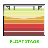Tahap FLOAT diindikasikan dengan tegangan muatan dikurangi menjadi 13,0 VDC dan 13,8 VDC dan dijaga konstan, sedangkan arus dikurangi hingga kurang dari 1% dari kapasitas baterai. Mode ini dapat digunakan untuk mempertahankan baterai tetap terisi penuh tanpa batas.
