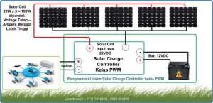 Maka kapasitas Daya Panel Surya panel itu adalah 24 x 10 = 240 Watt. Untuk menghasilkan kapasitas Daya 240W, modul Panel Surya harus beroperasi pada tegangan 24 Volt dan arus 10 Ampere. Harus kita ingat bahwa Panel Surya adalah perangkat dengan arus tetap. Tetapi jika Batery yang dicharger tersebut bertegangan dibawah tegangan Panel Surya , maka tegangan operasi Panel Surya secara otomatis menyesuaikan dengan tegangan Batery. Jadi kalau tegangan batery 12V, maka tegangan operasi panel akan turun dari 24 Volt menjadi 12V. Dengan demikian, kinerja Panel Surya bukan lagi 240 Watt, tetapi outputnya menjadi 12V x 10 A =120 Watt, nah itulah yang terjadi pada PWM tegangannya hilang..