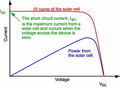 Short Circuit Current Isc, adalah maksimum output arus dari solar panel yang dapat dikeluarkan (output) di bawah kondisi dengan tidak ada resistansi atau short circuit. Pada kurva I-V diatas menunjukkan perkiraan arus 2,65 Ampere. Daya pada Isc adalah 0 watt.
