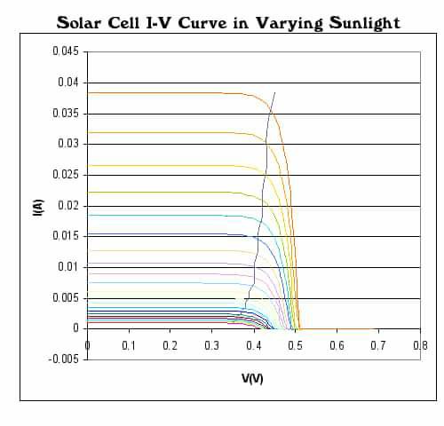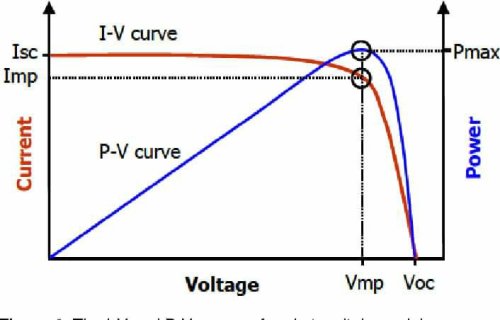 Gambar dibawah menunjukkan tipikal kurva I-V. Voltase (V) adalah sumbu horizontal. Arus (I) adalah sumbu vertikal. Kebanyakan kurva I-V diberikan dalam Standar Test Conditions (STC) 1000 watt per meter persegi radiasi (atau disebut satu matahari puncak/ one peak sun hour) dan dalam suhu 25 derajat Celcius/ 77 derajat Fahrenheit suhu solar panel. Sebagai informasi STC mewakili kondisi optimal dalam lingkungan laboratorium.