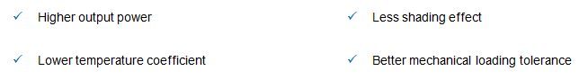 Multi-busbar (MBB) MBB berarti sel surya dilengkapi dengan 12 atau 16 busbar, bukan 4, 5, atau 6. Ini berarti modul memberikan output daya yang lebih tinggi dan keandalan yang lebih tinggi: seperti : - Daya output yang lebih tinggi. Terjadi peningkatan peforma 2% - 2,5% peningkatan daya (dalam kisaran % karena efek dan jenis sel biasanya berbeda) namun bisa kita kasih rentang 5-20watt penambahan yang bisa dihasilkan - Kinerja cahaya rendah (mendung) mampu memberikan performa yang sangat baik - Koefisien suhu yang lebih rendah sehingga tidak sering mengalami Overheat - Jalur distribusi aliran listrik menjadi lebih pendek untuk menghantarkan arus - Desain kawat reflektansi tinggi dengan sedikit naungan - Performa beban mekanis akan sedikit meningkat - Risiko retakan mikro (SNAIL TRACK) menurun