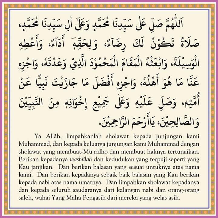 Allâhumma sholli ‘alâ sayyidinâ muhammadin wa ‘alâ â-li sayyidinâ muhammadin sholâtan takûnu laka ridhô an wa lihaqqihî adâ an, wa a’thihil wasîlata wab ‘ats hul maqômal mahmûdal ladzî wa ‘adtah, waj zihî ‘annâ mâ huwa ahluh, wajzihî afdhola mâ jâ zaita nabiyyan ‘an ummatih, wa sholli ‘alaihi wa ‘alâ jamî’i ikhwânihî minan nabiyyîna was shôlihîn, yâ arhamar rôhimîn.
