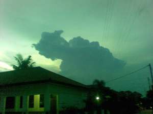 Kemarin sore tanggal 10 november 2011 jam menunjukkan pukul 5.40 terdengarlah adzan magrib berkumandang bergegas aku ambil wudzu dan tunaikan sholat magrib, setelah sholat segera aku bereskan laptop dan menyiapkan modul-modul karena rencananya malam ini kelompok kami akan maju persentasi fisika, semuanya sudah lengkap persiapan buat kuliah dan persentasi lalu kukeluarkan motor, kuhidupkan kemudian kujalankan. Tak kurang dari 300meteran motorku kuhentikan karena kulihat indikasi bensin sudah mendekati warna merah, entah kenapa aku tak sengaja melihat keatas langit kulihat awan seperti mendung tapi aku heran dan terbelalak melihat bentuk awan yang aneh ya…. sangat aneh, seperti orang yang duduk tasyahud dalam sholat, coba perhatikan subhanaAllah, segera kuambil hp nokia 5320 ku untuk mempotretnya, sungguh kawan coba perhatikan bentuk mulutnya, bentuk hidungnya, lekukan matanya, dan badanya sungguh menunjukkan lagi sujud, jika aqu perhatikan itu duduk diantara dua sujud karena badanya agak miring hendak sujud..namun sayang fotoku terhalang bangunan Sekolah dasar yang ada didepanku, bergegas segra aku jalankan motorku dan aku berniat mengambil foto dilokasi terbaik,