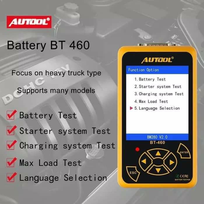 Battery Tester BT-460 saat ini mengadopsi teknologi pengujian konduktansi paling canggih di dunia untuk dengan mudah, cepat dan akurat mengukur kemampuan CCA yang sebenarnya dari baterai kendaraan, keadaan baterai yang sehat (SOH) dan kesalahan umum dari sistem starter kendaraan dan pengisian daya sistem, yang dapat membantu dalam pemeliharaan untuk menemukan masalah dengan cepat dan akurat, sehingga mencapai perbaikan yang cepat.